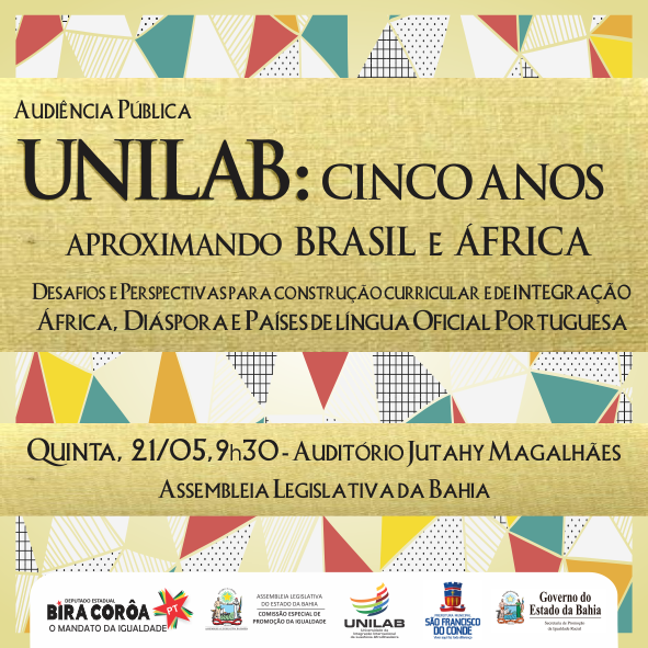 Nesta quinta-feira (21), acontece na Assembleia Legislativa da Bahia (Alba), no auditório Jutahy Magalhães, às 09h30, a audiência pública “Unilab: cinco anos aproximando Brasil e África”. O evento é em homenagem ao aniversário da instituição que completa cinco anos de atividades letivas, no Ceará, e um ano na Bahia, neste mês de maio. Além disso, é comemorado também o Dia da África (25), quando se festeja a fundação da Organização da Unidade Africana (OUA).